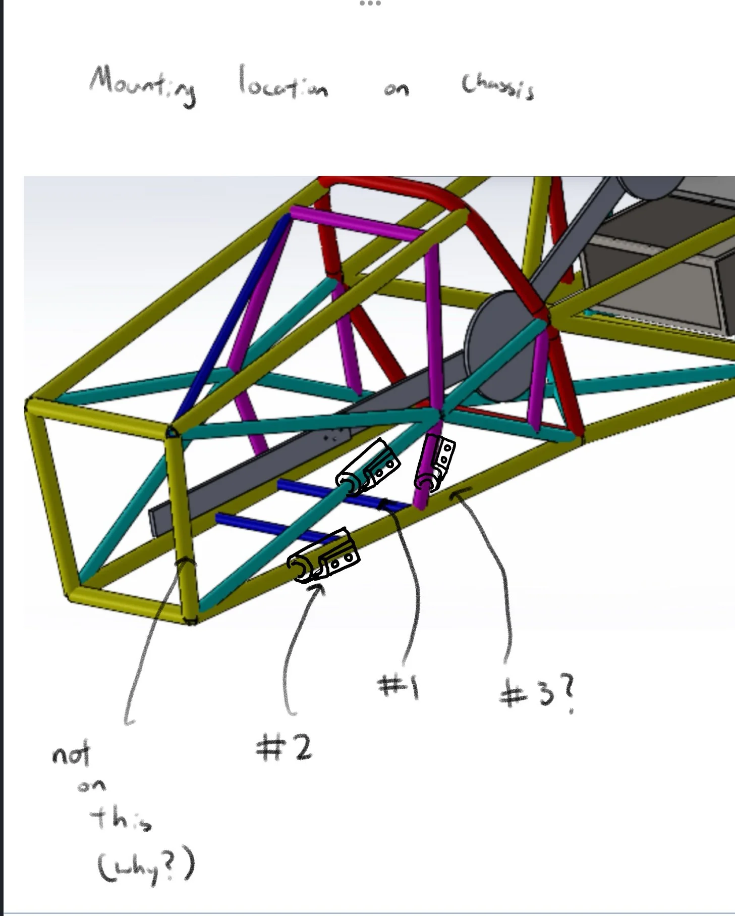 Challenges: Designing a clamp-structured bracket that can be screwed together and has an L-shaped component on a cylindrical solid. Previous year chassis had welded components used to mount the nosecone. Need to consider the position of the brackets and functionality (easy of putting NC on)